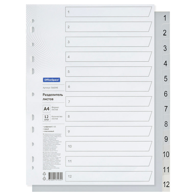 Пластиковые разделители листов OfficeSpace предназначены для сортировки и систематизации документов внутри папок, обеспечивают сохранность и аккуратность листов. Изготовлены из пластика толщиной 120мкм. Размер 224*297 мм. В комплект входят 12 листов серого цвета, обеспечивающих возможность сортировки документов по цифрам, а также титульный лист для оглавления. Удобны в использовании, перфорация позволяет подшивать разделители во все типы папок.
